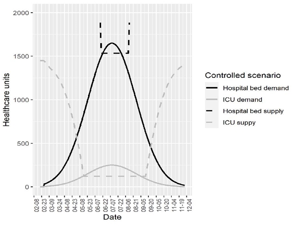 On the other hand, under the controlled scenario of mitigation measures, figure 5 depicts a much different situation. One of the main objectives of these paper is to quantify the benefits of social distance and other mitigation policies by reducing the pressure on the healthcare system. Under this situation, the demand for hospital beds would have exceeded the supply starting June 22, while the demand for ICUs would exceed the supply more than a month earlier, by May 16. The differences in areas between the supply and demand curves across scenarios provides a measure of one of the most important benefits of flattening the curve.