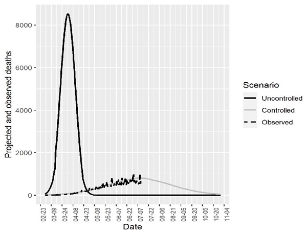 Figure 6 presents the results of my estimates of daily deaths flows, together with the observed number of deaths for 2020. Under the uncontrolled scenario, the accumulated number of deaths would have exceeded 214,000. On the other hand, under social distance and mitigation measures, the number of deaths is expected to be reduced to about 90,000. Under the uncontrolled scenario, a maximum of 8,525 daily deaths would have been expected versus a maximum of 808 daily deaths under the current controlled scenario.