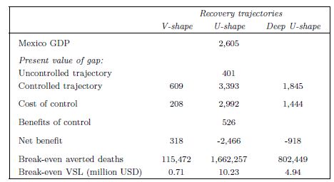 I monetize the benefits of mitigation measures using an estimate of the value of a statistical life (VSL) of 1.8 million USD, calculated by adjusting the VSL of 10 million USD commonly used in the US for cost-benefit analysis of environmental and transportation policies. I calculate benefits of 526 billion USD as the product of the VSL and the number of deaths averted by mitigation policies. Next, I compare these benefits to the costs in terms of output gap. Under a plausible recovery scenario in which the GDP catches up to its expected trajectory before the health and economic shocks, I calculate a negative net benefit of these policies of 2,466 billion USD (35% of Mexico’s GDP in 2019).