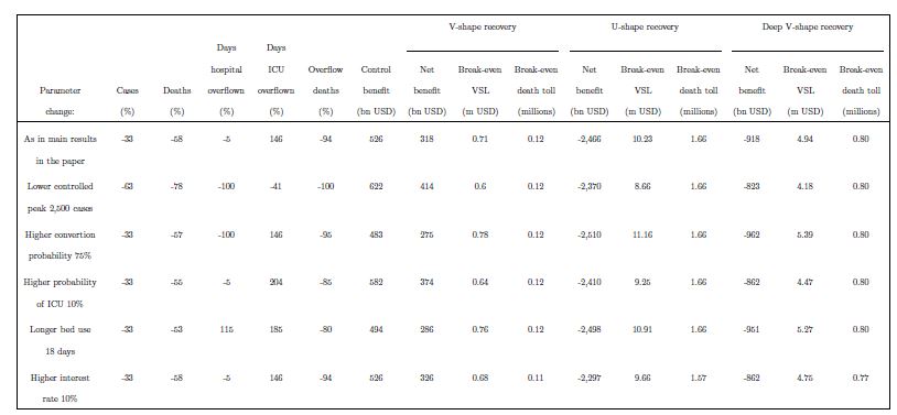 Thus, I present in table 11 a summary of the consequences of deviating from the parameters assumed in the earlier sections of this paper for the controlled scenario (the uncontrolled scenario remains the same) in terms of cases, deaths, days of overflown healthcare system, and monetized control benefit. I also present the net benefit, the break-even VSL, and the break-even death toll for each of the recovery trajectories. For each alternative parameter specification, I compare what the controlled scenario achieves with respect to the uncontrolled one. The first line of this table summarizes the findings described earlier in this paper. The mitigation strategies reduce the number of cases by 33% and the number of deaths by 58%. There are 5% less days of overcrowded hospitals and 146% more days of overcrowded ICUs. The mitigation policies reduced overflow deaths in 94%. The benefits of flattening the curve are monetized as 526 billion USD.