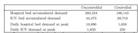 Similarly, according to Wu and McGoogan (2020), up to 5% of COVID-19 cases require ICU, which might include a ventilator. With these two proportions, an estimate of daily and accumulated demands for hospital beds and ICUs can be computed. Table 2 shows the results of these calculations. I estimate that 293,524 patients would need a hospital bed and over 44,473 would require an ICU under no mitigation measures. These figures decrease to 196,143 and 29,719 with mitigation policies. Thus, mitigation measures reduced total healthcare demand by 33% and demand at the most critical date by 85%.