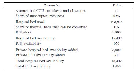 Daily bed availability depends also on the number of days each resource is used. Ferguson et al. (2020) and Greenstone and Nigam (2020) assume every ICU patient uses a bed for 12 days, somehow lower than the reported hospitalization duration of 15 days in Hong Kong, Japan, Singapore, and South Korea (Gaythorpe, 2020). Guan et al. (2020) estimate that the average hospital stay is 12 days long. In this paper I assume an average length of use of 12 days.