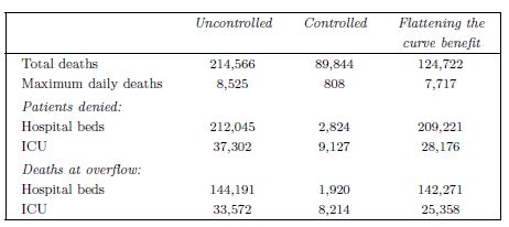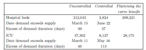 Some limitations of my analysis deserve to be discussed for future research. In this paper, I assume that the differences in fatality rates for patients that receive appropriate healthcare versus those who are denied it are independent of the age profile. Verity et al. (2020) have shown that fatality rates differ across age groups. A recent debate on the ethical dimension of assigning medical resources questions whether younger patients should be allocated for treatment first. In my calculations I have implicitly assumed random assignment of patients to healthcare in case of overflow. If one assumes some form of sorting in the assignment, the net cost of the control is likely change. Studying the implications of different rules for assigning patients is part of an open agenda.