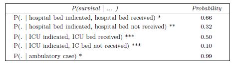 If ICU is indicated and the system is below surge capacity, the survival probability is 50% (Wu and McGoogan, 2020; Greenstone and Nigam, 2020). On the other hand, with the system above surge capacity, patients that require an ICU and do not get appropriate treatment have a 10% survival probability (Ferguson et al., 2020; Greenstone and Nigam, 2020).