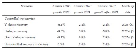 For each recovery trajectory, I calculate the present value of the stream of quarterly gaps with respect to the business-as-usual trajectory. To discount future flows, I use a discount rate of 5%. The difference between the uncontrolled recovery trajectory and each of the controlled trajectories is the measure of the cost of mitigation policies. Table 10 presents the third set of key results of this paper.