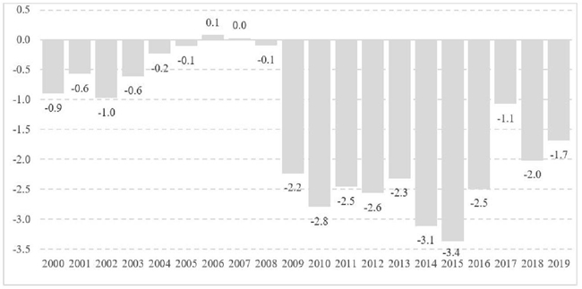 En el periodo 2000-2019, el déficit fiscal del sector público en México promedió un 1.5% del PIB, menos de lo observado en 2018 y 2019, de un 2.0% y un 1.7%, respectivamente (véase la gráfica 1). El incremento del déficit a lo largo del periodo de referencia fue consecuencia de una desaceleración en los ingresos totales, principalmente provenientes de los ingresos petroleros, y un incremento constante en los gastos totales, particularmente de los gastos corrientes.