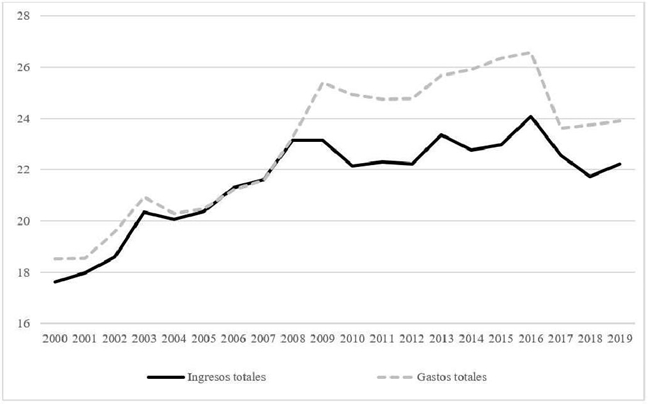 Los ingresos totales del sector público en México aumentaron de un 17.6% del PIB en 2000 a un 22.2% en 2019. Sin embargo, los gastos totales también crecieron y en una proporción mayor en dicho periodo. Estos últimos pasaron de un 18.5% del PIB en 2000 a un 23.9% en 2019 (véase la gráfica 2). Además, es relevante señalar que el aumento en el gasto corriente fue parcialmente contrarrestado por la disminución de la inversión pública.