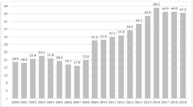 En una perspectiva de largo plazo, en el periodo 2000-2019, México registró un incremento acumulado en su cociente de deuda a PIB equivalente a 25.6 puntos porcentuales, ya que pasó de un 19.9% en 2000 a un 45.5% en 2019 (véase la gráfica 3). Si bien, el gobierno federal ha realizado esfuerzos importantes en los tres años más recientes, esta trayectoria podría traducirse en una tendencia de incremento de largo plazo en su razón de deuda en términos del PIB debido, entre otros factores, a la perspectiva de crecimiento económico moderado en los próximos cinco años.