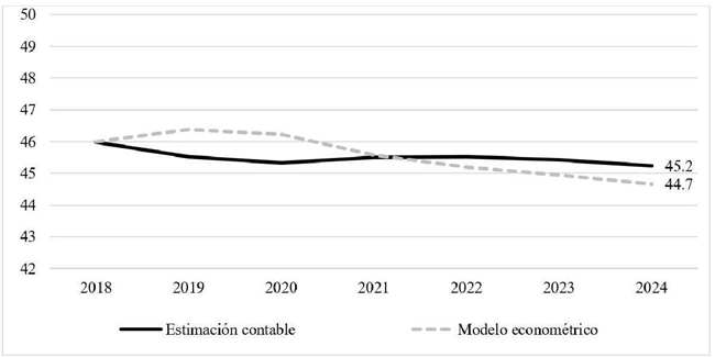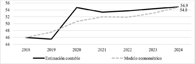 Las diferencias entre los modelos contables y econométricos se explican principalmente por el procedimiento empleado, el tamaño de la muestra utilizada (en el primer caso se usa como año base 2018 y en el segundo se usan datos para el periodo 1990-2018) y por las diferentes variables utilizadas para construir el modelo econométrico. Todo ello no descalifica el uso de uno u otro modelo, más bien los fortalece, porque al reportar trayectorias similares, se refuerzan los hallazgos de cada procedimiento.
