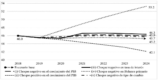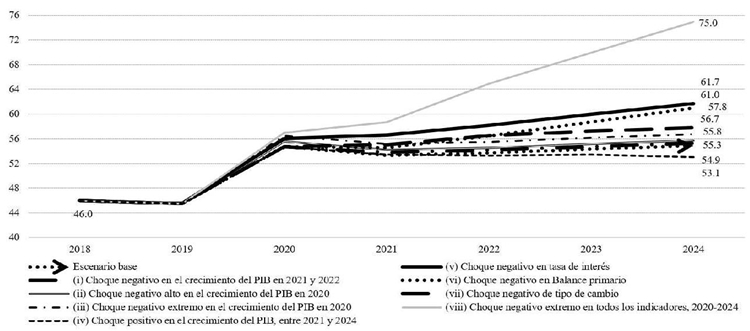 Para evaluar el impacto de choques internos y externos sobre la deuda, se estimaron cinco escenarios con los diferentes choques posibles que podrían experimentarse en el país. De esos cinco escenarios, cuatro de ellos son negativos y uno positivo, lo que tiene que ver con choques en la tasa de crecimiento económico (uno negativo y otro positivo), en la tasa de interés, en el balance primario y en el tipo de cambio.