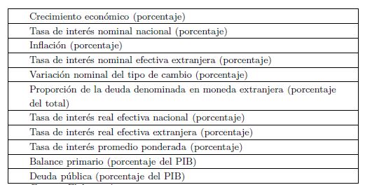 A partir de la expresión anterior, se obtiene el coeficiente de la dinámica de la deuda automática utilizando la tasa de crecimiento económico, la inflación, la tasa de variación del tipo de cambio, la proporción de la deuda denominada en moneda extranjera y las diferentes tasas de interés para la deuda.