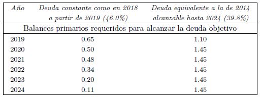 Ahora bien, si se pretendiera alcanzar en 2024 un nivel de deuda como porcentaje del PIB, como el que se observó en 2014 (39.8%), entonces el gobierno de México hubiera tenido que hacer un esfuerzo para lograr superávits primarios equivalentes a 1.10% del PIB en 2019 y de 1.45% en todos los años, desde 2020 hasta 2024.