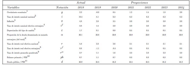 En el análisis de sostenibilidad de deuda pública se utilizaron las variables macrofiscales que inciden en el desempeño y la dinámica de la deuda pública total para el periodo 1990-2018. Se tomó este periodo debido a que los datos están disponibles para todas las variables. La información se obtuvo de la base de datos oficiales, de la SHCP, del INEGI y del Banco de México. Además, se proyectaron algunas series para el periodo 2019-2024, considerando desempeños realistas y acordes con su evolución histórica entre 1990 y 2018. Para corroborar la idoneidad de estas estimaciones se compararon con las trayectorias de estas variables disponibles en los informes publicados por el gobierno de México.2