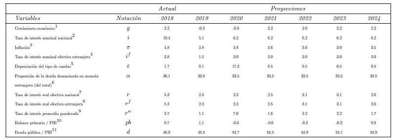 Adicionalmente, para determinar si algún choque sobre la evolución de las finanzas públicas puede tener efectos sobre la trayectoria de la deuda pública en el largo plazo, se establecieron diferentes escenarios sobre las principales variables macroeconómicas del país (incluyendo los efectos de la pandemia por COVID-19).