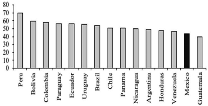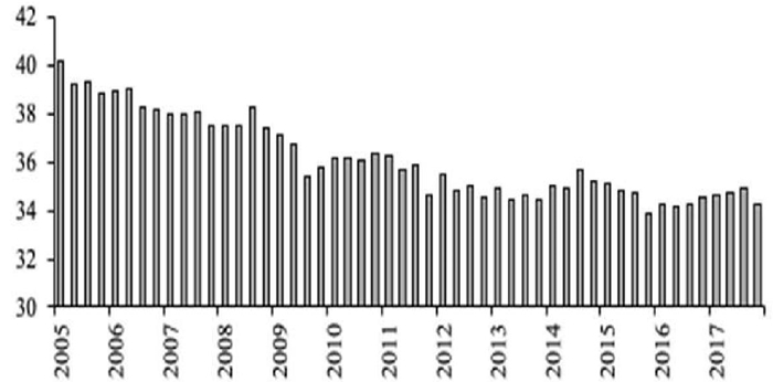 Mexico still has one of the lowest FLFP rates in Latin America at 43.6 percent in 2017 (figure 1). Although FLFP in Mexico has increased significantly -by about 10 percentage points since 1990-this number is still low compared to the average FLFP rate for Latin America, which is close to 53 percent.3 Nevertheless, after the 2008 crisis, Mexican women swiftly entered the labor force, significantly narrowing the labor participation gender gap. Figure 2 shows how the gap steadily narrowed from 39.3 to 34.7 percentage points between the second quarters of 2005 and 2017.4