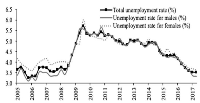 The 2008 global financial crisis also sharply increased Mexico’s unemployment rate (figure 3), yet the gender unemployment gap still closed almost completely. Before the crisis, some periods showed female unemployment rates close to one percentage point higher than male unemployment rates, but this gap closed after the crisis. Specifically, the gender unemployment rate gap between the second quarter of 2005 and the second quarter of 2008 averaged 0.53 percentage points, compared to 0.25 percentage points during and after the crisis (2008Q3 to 2016Q4).
