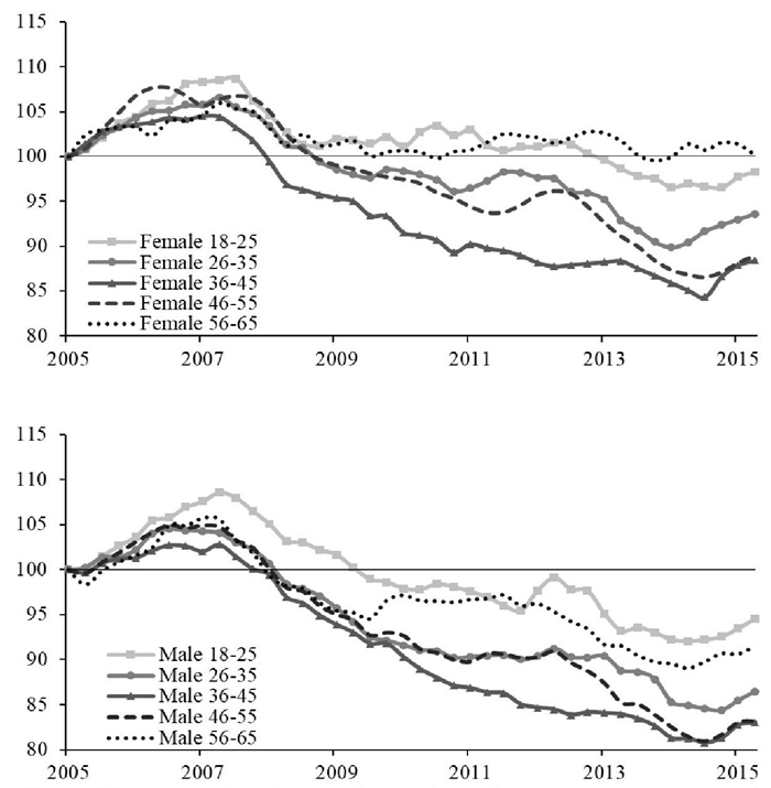 Real wages persistently declined for all male groups and most females, with a starker fall for males (figure 5). For both males and females, the 36-to-54 age group experienced greater declines; and for the oldest group of females (56-to-65), real wages stagnated but did not decline. Therefore, the economic forces driving the increase in FLFP cannot be wage considerations or a substitution effect. The increase in FLFP in Mexico after the protracted 2008 crisis is due to an important demographic component, but it also may be associated with the added-worker effect (income effect) or some other factors (addressed later in this paper).
