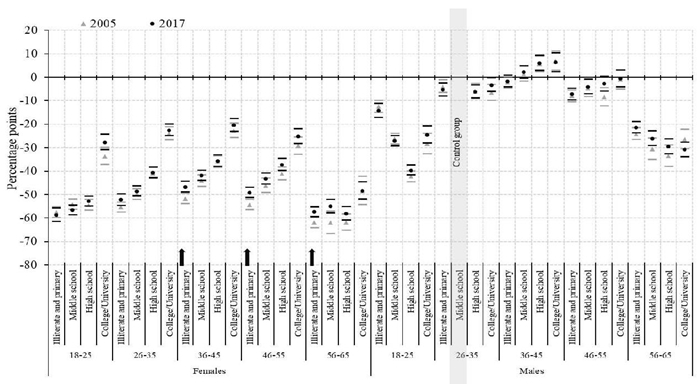 Figure 6 shows the estimated probability of females being employed according to their age and educational attainment, compared to a male with middle-school education in the 26-to-35 age group. We estimated coefficients and their respective confidence intervals for 2005 (light-gray bars) and 2017 (black bars). Only where confidence intervals do not overlap can we conclude statistical significance regarding a change in the probability of women being employed between 2005 and 2017.