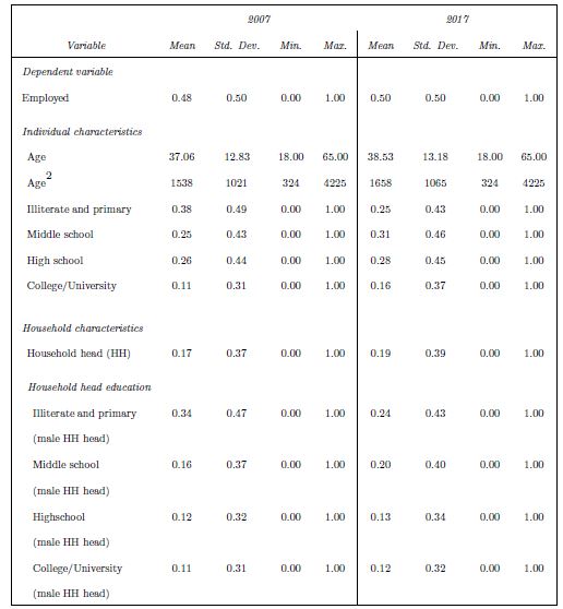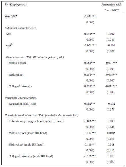 Where F is the standard normal cumulative distribution function; and  are sets of explanatory variables at the individual, household, and labor market levels, respectively. Unlike Klasen and Pieters (2015), we do not estimate the model separately for each year but pool both years in the same regression, and we include a dummy variable for the year 2017. We also include an interaction term for each variable with the 2017 dummy to observe whether the explanatory variables have a different effect on women’s employability in 2017 compared to 2007.