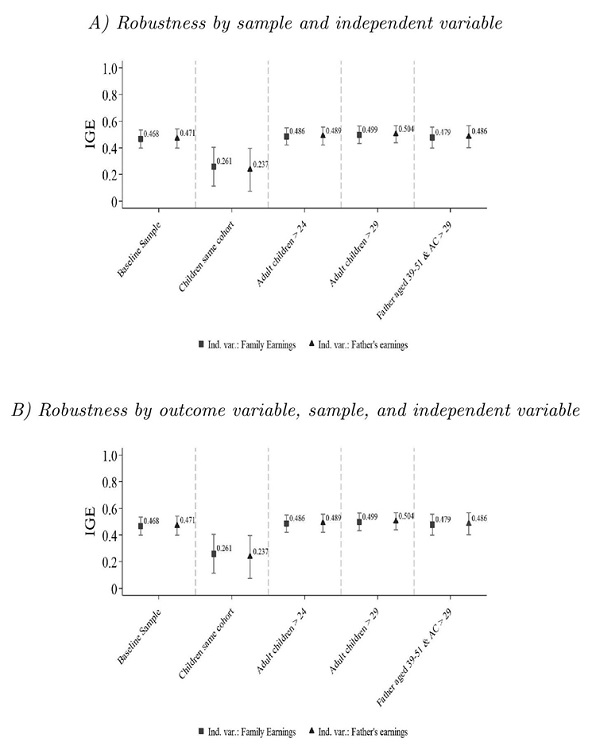 A second concern about our IGE estimates is the extent to which economic persistence takes place in family earnings rather than in adult children’s earnings. For this robustness check, we use specification (2), changing the dependent variable to the log of family earnings, that is, adding the earnings of adult children and their spouses. Figure 1, panel B plots these IGE estimates along with their 95 percent confidence intervals across different samples and independent variables. In the baseline sample, the estimates increase substantially, by 22.8 percent with respect to the baseline estimate. The increase is consistent across different samples, with slight differences due to adult children’s age or the use of father’s instead of family earnings as the key independent variable. Although we are not able to formally test the factors driving the IGE upwards, it may be that marital sorting factors lead to a higher level of economic persistence across generations (Chadwick and Solon, 2002; Ermisch et al., 2006). In this sense, intergenerational mobility in Mexico has an important component derived from marriage decisions.