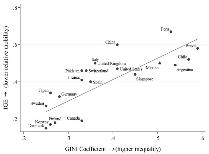 Cross-country differences can shed light on the role of three fundamental factors in determining children’s economic outcomes: family background, labor markets, and the role of the state (Solon, 2004). Corak (2016) argues that cross-country differences are related to differences in the transmission of inequality due to differences in the investments in children made by different societies, and the return on those investments. These processes include family background (i.e., investment in human capital), labor markets (i.e., returns to education), public policy (i.e., progressive reforms like increasing education and health care for the poor) and their interactions. By understanding how these factors influence intergenerational earnings mobility in Mexico and its differences with other countries, we can understand better what is needed to change the ways in which inequality is transmitted from one generation to the next.17