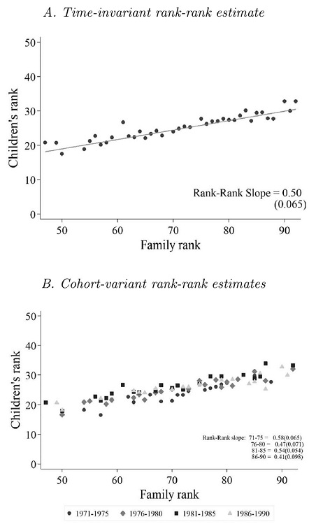 These results appear to be similar to those from a recent estimate by Torche (2020), who builds a socioeconomic index accounting for a family’s durable goods, assets, and services as a proxy for economic persistence across birth cohorts, and finds that intergenerational economic association increases for individuals born between 1950 and 1970, but decreases for younger cohorts.
