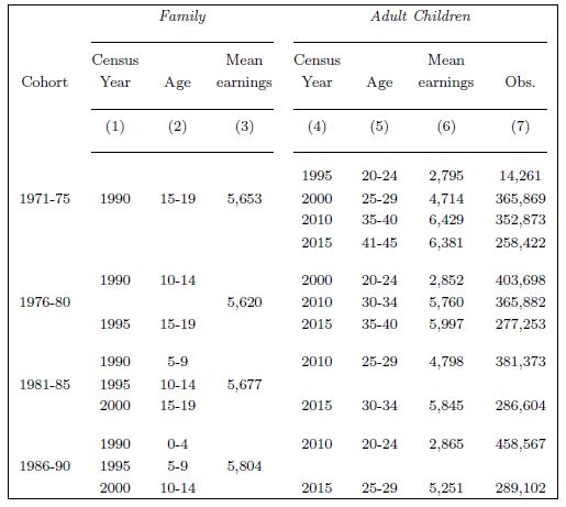 Mexican censuses do not link individuals across years. We thus follow the synthetic approach of Aaronson and Mazumder (2008), which requires a core sample that clearly distinguishes between adult children and synthetic families, allowing us to compare how much adult children’s earnings differ from their synthetic family earnings. We define adult children as men who are 20 years old in the 1995-2015 censuses; these individuals are old enough to report earnings.6 Synthetic families are defined as representative family units where adult children are likely to be members, as determined by two variables: the state in which they were born and their birth cohort. The earnings of such representative families are the synthetic family earnings. With these definitions, synthetic families are observed in the 1990, 1995, and 2000 censuses, and adult children are observed in those of 1995, 2000, 2010, and 2015. For example, a 30-year-old man born in Mexico City who reports earnings in the 2010 census is virtually matched with a Mexico City family reporting earnings in the 1990 census, whose children were approximately 10 years old at that time. For the purposes of this study, we consider four birth cohorts: 1971-75, 1976-80, 1981-85, and 1986-90. We take the state where they were born, as reported in the censuses; since there are 32 states, the number of representative families is 128.