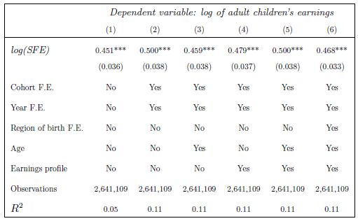 . All coefficients are positive and statistically significant at the 1 percent level. Column (1) shows the IGE estimate with no controls, and column (2) adds cohort and year fixed effects. Column (3) shows the results for a quadratic polynomial for age, and column (4) those for the polynomial with each term interacting with family earnings. Column (5) presents the IGE estimate with region of birth fixed effects. Column (6) presents the IGE estimate considering all of the controls specified in equation (2). With no controls the estimate suggests that a 1 percent increase in family earnings is associated with an increase of 0.45 percent increase in adult children’s earnings. Columns (2) and (3) suggest that the estimate is barely modified when including fixed effects and the age earnings are measured. Columns (4) and (5), which incorporate all life-cycle controls, suggests that the absence of such controls does bias the estimates downwards. Finally, column (6) shows that the IGE estimates decrease by 6.4 percent with respect to those shown in column (5).