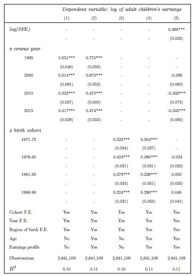 The last column, which considers our most flexible specification, also supports the argument that intergenerational mobility has increased in recent times, and enables us to determine whether the increase is driven by census-year or birth-cohort effects: the prevailing effect is the one observed across census years. Interpretation of these estimates suggests that people in the 1971-75 birth cohort have an estimated IGE of 0.8 in 1995. This estimate decreases to approximately 0.5 in 2010 and 2015; the estimate for 2000 is not statistically significant. The fact that interactions between cohort and family earnings are not statistically significant indicates that all cohorts follow the same trend.