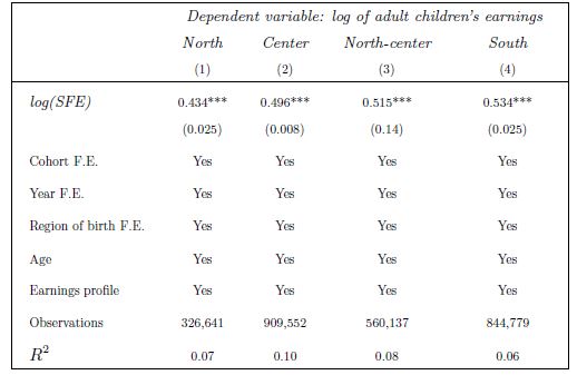 Table 4 shows the results for IGE by region of birth. As previously explained, we consider four regions: north, center, north-center, and south. Column (1) reports the IGE estimates for the north, column (2) for the center, column (3) for the north-center, and column (4) for the south. All estimates account for census-year fixed effects, birth-cohort fixed effects, and lifecycle factors. In general, the estimates suggest that region of birth plays an important role in intergenerational mobility, and that there is heterogeneous mobility across regions. The highest level of intergenerational mobility is in the north, followed by the center, then the north-center, and finally the south. A 1 percent increase in synthetic family earnings is associated with a 0.43 percent increase in adult children’s earnings in the north, 0.49 percent in the center, 0.52 percent in the north-center, and 0.53 percent in the south. Unfortunately, there is not enough data to identify statistical differences between regions.