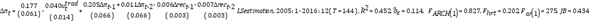is the standard error of the model. We include two tests for heteroskedasticity: the autoregressive conditional heteroskedasticity test, FARCH(1) , and the White test, Fhet . For serial correlation, we run a Lagrange multiplier test, Far(1) , and we use the Jarque-Bera test, JB, for normality. All tests indicate that the model presents no problems of ARCH errors, autocorrelation, heteroskedasticity, or non-normality.21 We report the p-values of these diagnostic tests. To arrive at these well-behaved equations of inflation dynamics, we test different numbers of lags for all supply-shock variables, unemployment, and inflation. We use this same specification of inflation dynamics for all methodologies (including the state-space models), so that in all cases the variables included and the structure of lags are the same.