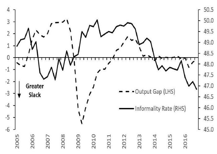 One of the key features behind the presence of informality in some economies is the low flexibility of their labor markets. Different degrees of flexibility in formal and informal labor have implications for the cyclical adjustment of labor markets. During recessions, for example, wage flexibility in the informal sector allows the market to absorb individuals who do not find formal employment: workers who would otherwise be unemployed. This dynamic would imply that the informality rate is countercyclical a stylized fact amply documented in the literature (see, for example, Chiquiar and Ramos Francia, 1999; Alcaraz, 2009; Gasparini and Tornarolli, 2009; Fiess et al., 2010; Perry et al., 2007; and Peterson, 2014).2Figure 1 shows the evolution of the informality rate and the output gap in Mexico, which indeed suggests that the informality rate in the Mexican economy follows a countercyclical trajectory.3