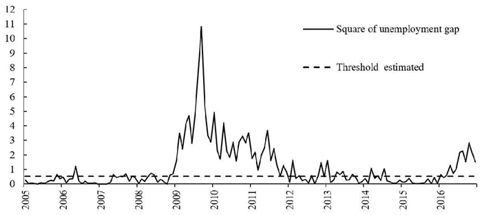 The predetermined variable which helps us to determine the threshold is the square of the traditional unemployment rate gap,
