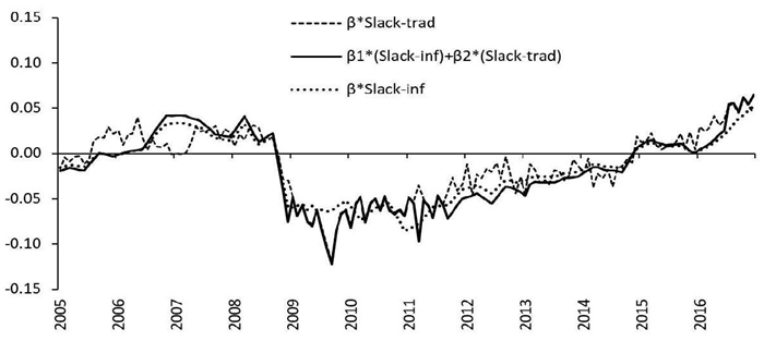 These results might be explained by a period with a high rate of job creation where slack-trad reflects a tight labor market. However, if this period also showed a high rate of low-quality informal labor growth, slack-inf might show a different history, one with a higher level of slack, given that it accounts for this low-quality employment. In such a case, slack-inf could reflect inflationary pressures more accurately.28 The specification of the inflation equation can be decomposed into terms for the determinants of slack, inertia, and supply shocks. In figure 11 we compare the contribution to inflation of the slack components of models (1) and (2) in table 3 with that of the preferred model resulting from threshold regression analysis in table 4. We see that around 2007 the