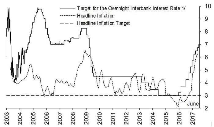 Finally, it is important to note that Banco de México started tightening monetary policy conditions in December 2015 (figure 13). However, it was emphatic that such pre-emptive policy rate increases were driven by other exogenous shocks at the time (most importantly, exchange rate depreciation) and not by demand-pull inflationary pressures (see Banco de México, 2016).