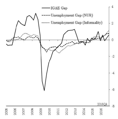 The reading of the economic cycle is essential to the formulation and implementation of monetary policy. Economic indicators such as the gross domestic product, credit indicators, interest rates, and unemployment can help to assess the current stage of the business cycle and thus the appropriate policy stance. The analysis is even more sensitive when there is a transition from an expansionary stage of the economy to a contractionary one, or vice versa. An important topic in monetary policy focuses on whether employment is approaching its potential: the rate of unemployment at which inflation remains constant in the absence of supply shocks. This rate is called the non-accelerating inflation rate of unemployment (NAIRU). However, the estimation of the NAIRU is complicated, because it is not directly observable. In Mexico and other Latin American countries, the presence of a sizeable number of informal workers imposes an additional challenge. The existence of unions, the degree of centralization in the bargaining process, distortions caused by labor legislation, the existence of monopolies, and other factors could limit labor market flexibility in the formal sector. However, the lack of labor regulation in the informal sector official promotes a competitive equilibrium and greater wage adjustment in that market.