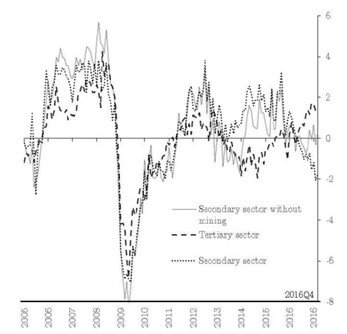 In this section, we compare the trajectories of slack-trad and slack-inf with the main employment-related economic variables to assess and compare their effectiveness in anticipating demand-driven inflationary pressures. In order to facilitate the analysis, we divide the time span into three periods that take into account the economic cycle in Mexico (figure 12). The first is the pre-crisis period, from 2005Q1 to 2008Q4, which was characterized by inflationary pressures: the GDP gap was positive with the lower bound of the confidence interval close to zero. The second period spans 2009Q1 and 2014Q2, the post-crisis economic slack. The third, from 2014Q3 to 2016Q4, starts with the output gap near zero, and remains close to zero until the end of the study period.
