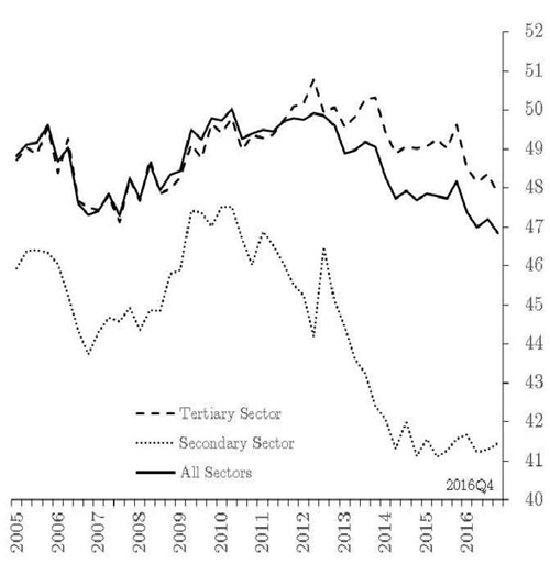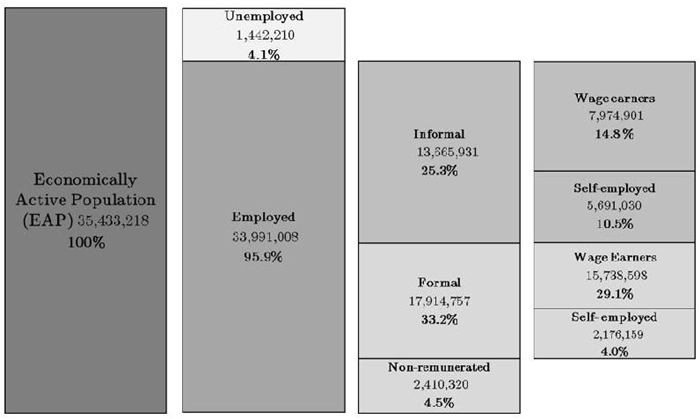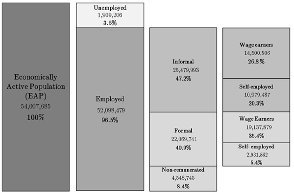 In order to assess the participation of our proposed new indicator of labor slack slack-inf within the Economically Active Population (EAP), we calculate the EAP composition from the National Survey of Occupation and Employment (Encuesta Nacional de Ocupación y Empleo, ENOE) data, using expansion factors to obtain population-representative data, as shown in figure 2.5 The data correspond to the survey of the fourth quarter of 2016. Among the population aged 15 years and older, just over 35 million are economically active, and of these, 4.1 percent were unemployed. There were just under 34 million who were employed, almost 13.7 million of them were informal. In turn, informal wage earners (informal employees) represented 14.8 percent of the EAP in the fourth quarter of 2016. Our alternative rate of unemployment, taking informal labor into account, was 26.6 percent (the traditional unemployment rate of 4.1 percent plus the informal wage earners’ rate of 22.5 percent). It is important to notice that non-remunerated workers (workers that receive no wage) represented 6.8 percent of the EAP. These workers earn some kind of non-monetary income but it is not observable. Furthermore, in general, these workers have a particular type of labor relationship associated with family activity. In line with other empirical labor market studies, we exclude these workers from our analysis.