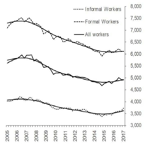 The data on informal wage earners comes from INEGI’s ENOE, a quarterly household survey with a rotating panel structure, from 2005 to 2016. Every quarter, INEGI replaces one-fifth of the sample: each household is thus followed for five consecutive quarters. The purpose of the survey is to collect data on the employment situation of Mexicans aged 15 and older in rural and urban areas. It is possible to identify informal wage earners in this survey, as defined by the ILO (2003). We assume that workers are informal if they are wage earners without any of the following mandatory benefits: IMSS (social security), ISSSTE (social security for government employees), Afore (retirement benefits), INFONAVIT (home loan), or private health insurance. For comparability purposes, we convert the quarterly informal labor data to monthly data using linear interpolation15 because the rest of the variables considered are available as monthly data.16