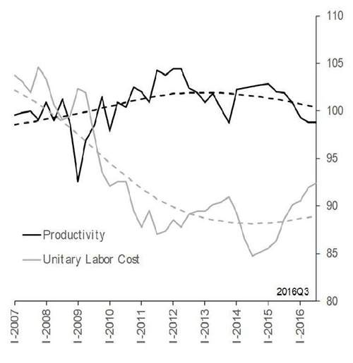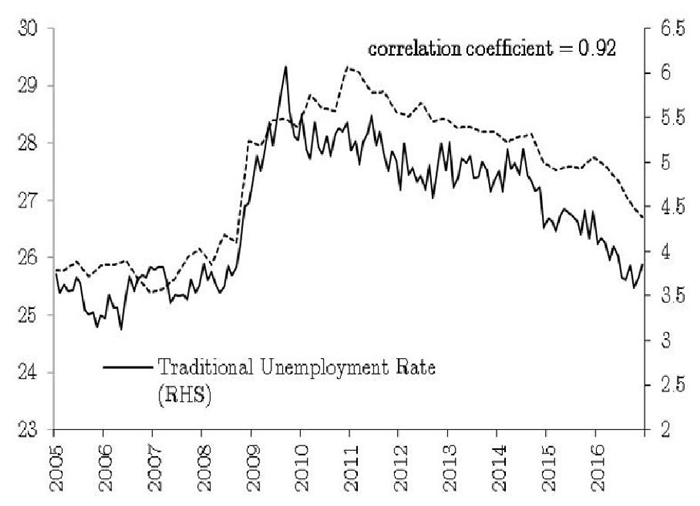 is the traditional (trad) or extended (inf) unemployment rate, and