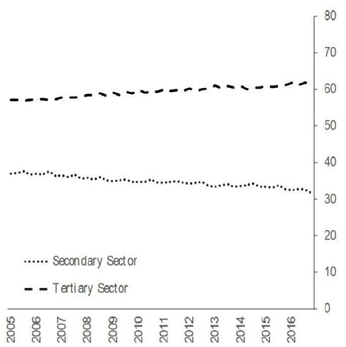 In order to understand this conundrum, we analyze this part of the cycle by separating economic activity in the service and industrial sectors. The slack in the IGAE during Period III is fully accounted for by the negative output gap in the secondary sector (with and without mining) since the end of 2015. In contrast, the tertiary sector (services) output gap closed and crossed into positive territory toward the end of the period (figure 14b). The tertiary sector is also more labor intensive and has a higher level of informal employment than the secondary sector (figures 14c, 14g, and 14h). Finally, the informal sector has considerably lower wages than the formal sector (figure 14d). These three factors provide a plausible explanation of why labor market conditions during this period did not translate into demand-pull inflationary pressures: the service sector, with the highest degree of informal employment and significantly lower wages, was the only productive sector that tightened. Thus, the labor market in Mexico seems to have allowed an adjustment in which workers without formal employment could be absorbed by the service sector into lower-paying jobs, without implying significant inflationary pressures from aggregate demand. During this period, both measures of slack start to suggest tighter labor market conditions. However, once again, slack-inf shows a subtle difference from slack-trad. Figure 8 shows that slack-inf suggests less tightness in the labor market than slack-trad, which is consistent with an absence of wage pressures and lower labor costs, both in the service and industrial sectors.
