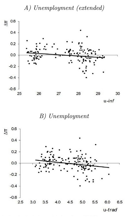 Figure 4 shows scatter plots of the change in annual inflation against the two measures of unemployment. First, it should be noted that there is indeed a negative relationship between the variables. The correlation between the changes in annual inflation and