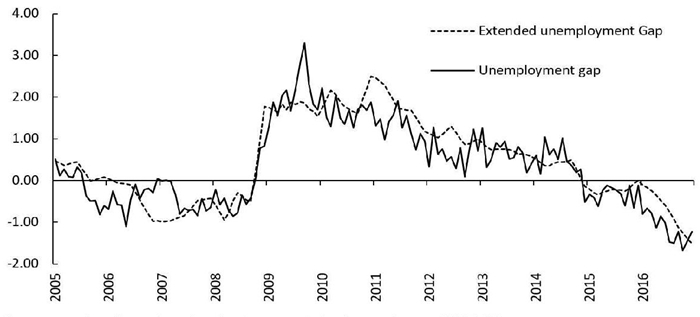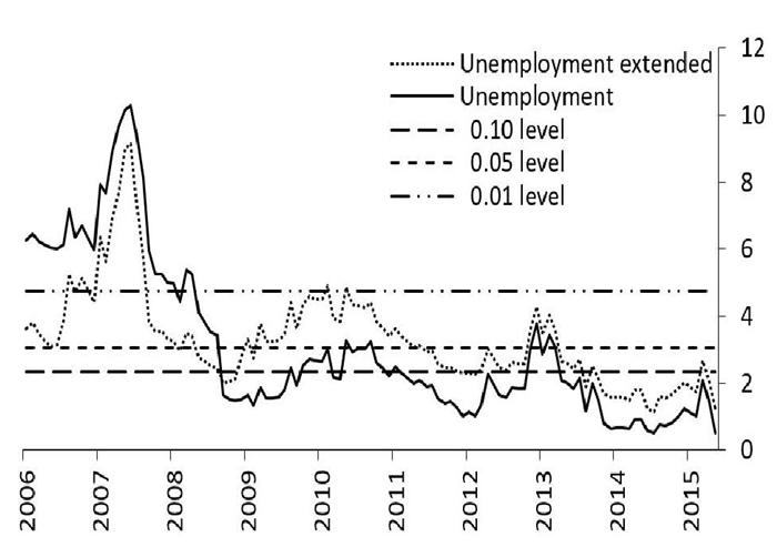 . Figure 3 shows both the traditional unemployment rate and the extended unemployment rate used in our estimation. These variables show a high level of correlation: 0.92. However, unlike the traditional unemployment rate, it seems that the extended unemployment indicator did not return to the levels observed prior to the 2009 crisis.