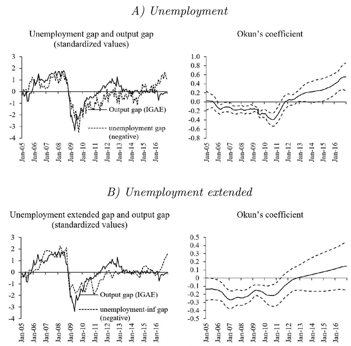 A standard national accounts statistical procedure is to update the base year to estimate the Gross Domestic Product (GDP) series. This process includes an important effort by the Mexican National Institute of Statistics and Geography (Instituto Nacional de Estadística y Geografía, INEGI) to update the value of the different goods produced in the economy. The GDP series is thus more accurate and the historic GDP series changes, both in terms of level and growth rates. This change may affect the measurement of economic activity and, as a result, the estimation of economic activity slack in real-time.4 However, labor market slack is not subject to this problem, because the variables used to compute this indicator are generally based on the number of employed or unemployed workers and is not subject to periodic revisions. These considerations highlight the importance of taking labor market information into account to evaluate slack in the economy in real-time.
