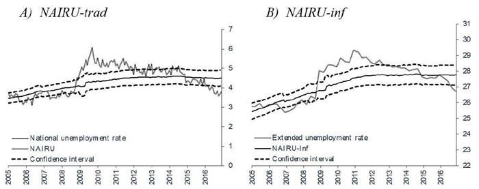 is the economically active population17 (unemployed plus employed) within the total population aged 15 or older. In the estimation including informal employment (NAIRU-inf), we calculate an extended measure of unemployment