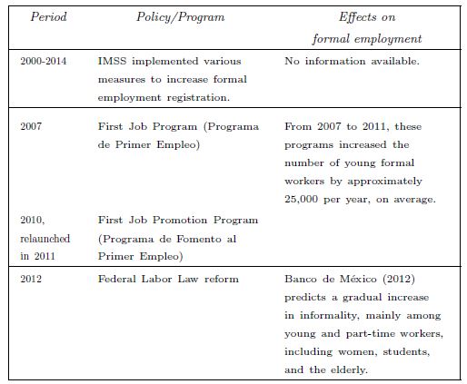 Since our empirical strategy allows for changes in the NAIRU over time, we do not expect that gradual changes in the informality rate caused by these measures will bias our results. In order to assess the magnitude of this problem, we list in table 1 all the actions taken during the study period that encouraged worker registration, and we link them to the informality rate over time (see figure 1). Mexico’s primary social security institution, the Mexican Social Security Institute (Instituto Mexicano del Seguro Social, IMSS), regularly sponsors campaigns to encourage formalization of employment. However, none of these campaigns seem to have resulted in a significant decrease in informal employment. The government also promoted a series of ‘first job’ programs encouraging young workers to register in 2007 and 2010. According to administrative data, these programs registered 25,000 workers per year. If we consider that approximately 700,000 new workers register at IMSS every year, it is clear that these programs did not meaningfully increase formality during the time span of our analysis.