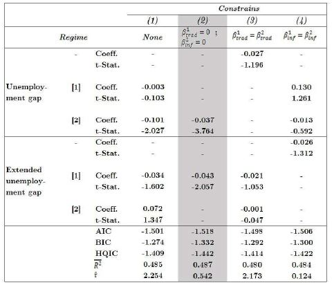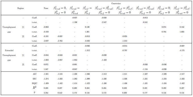 is close to zero (values, regardless of the sign, of the traditional unemployment gap closer to zero) there is a statistically valid partition in which the information of each gap is exploited. A model with its corresponding threshold is estimated for each constraint, and we choose the best model according to the information criteria. Table 4 reports the main results; the full results and constraints can be found in Appendix C. In this methodology (Bai and Perron, 2003), the threshold is determined endogenously using the information criteria from the global minimization procedure.