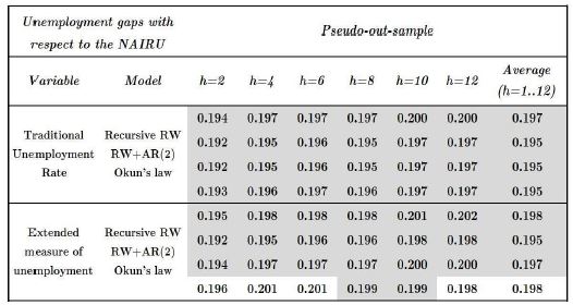 The exercises are carried out to evaluate the predictive capacity of the models with different measures of unemployment gaps. This is a pseudo-out-of-sample exercise for different forecast horizons, h = 1,2,...12 , and the average of these horizons. For this exercise, we use the subsample that covers from 2006:12 to 2016:12, with a rolling window of 60 observations.24 The sample for the forecast evaluation considers approximately 35 percent of the full sample (2013:1-2016:12), which corresponds to 48 forecast periods.