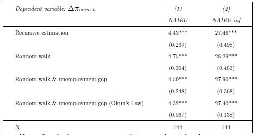 However, in order to allow the relationship between unemployment and inflation to vary over time, we compute the path of the NAIRU through a recursive estimation of equation (2), leaving the starting point of the sample fixed as follows: