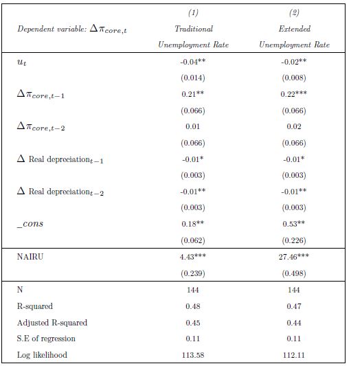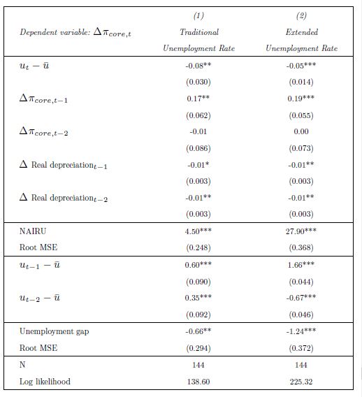 In the specification of equation (1), the unemployment gap could have a contemporaneous and a lagged impact on inflation. In order to simplify the NAIRU estimation, we assume that